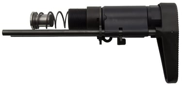 Der Schaft ist von dem Schubschaft der MP5 inspiriert und lässt sich vollständig bis zum Ende der Buffer Tube einschieben. Geführt wird der Schaft von zwei runden Stahlstangen, die in Führungen an der Buffer Tube laufen. Im eingeschobenen Zustand werden die Stangen durch die Ösen der Endplate des Recievers geführt und zusätzlich von Führungen im Lower-Reciever gesichert. Letztere werden durch extra Gewinde im Gehäuse eingeschraubt, wie in den Bildern zu erkennen ist.
