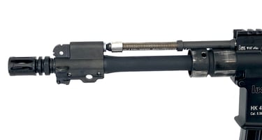 Mit gekürztem Lauf, Schubschaft und funktionierendem Gassystem fehlen nur noch wenige Kleinigkeiten für den perfekten original Look. Als Mündungsfeuerdämpfer ist ein Vortex Flash Suppressor von Smith Enterprise auf der originalen HK416C verbaut. Darüber liegt das HK Klappkorn für die Gasabnahme der 416 Reihe. Ein weiteres Detail ist der Handstop inklusive Ösen an der 6 Uhr Rail des 7" Handguards. Dieser wird an das vordere Ende geschraubt. Abschließend fehlen nur noch die Bohrungen im Reciever für die Führungen der Stangen des Schafts.