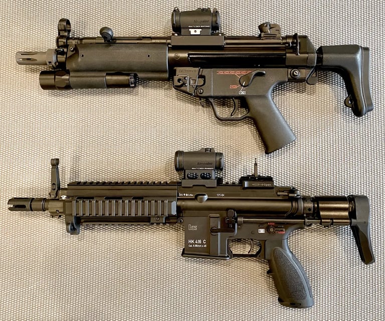 Abbildung 2: Größenvergleich zwischen der Maschinenpistole Heckler und Koch MP5 im Kaliber 9 mm und der HK416C im Kaliber 5,56 x 45 mm. Im eingeschobenen Zustand sind beide Waffen in etwa gleich groß. Quelle: Cpt Rex, HKPro.com, 2021, https://www.hkpro.com/threads/hk416c-build.333546/page-11