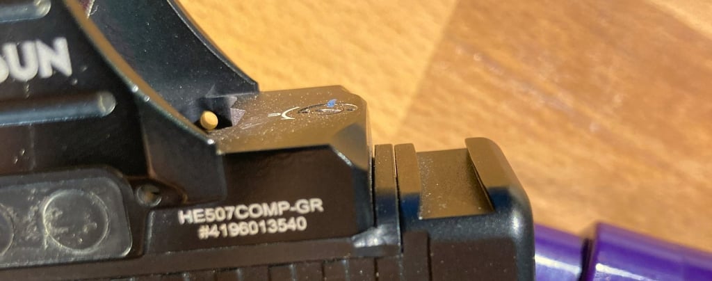 Bevor ich die Waffe bekommen habe, hatte ich mir bereits am Black Friday davor eine Holosun 507 Comp(etition) mit grünem Leuchtpunkt gekauft. Zu diesem Zeitpunkt war dieses Dot das größte Mini-Dot, das mir bekannt war, zu einem günstigeren Preis als andere Optionen. Das grüne Absehen kannte ich bereits von Airsoft-Optiken und ich bin heute immer noch begeistert vom Absehen. Hätte ich bei jeder Optik die Wahl, würde ich mich vermutlich immer für Grün entscheiden. Meine Iron Sights habe ich komplett entfernt, da ich immer mit Optik schieße, meine Batterien profilaktisch wechsle und Ersatzbatterien dabei habe. Selbst wenn meine Optik mitten im Match ausfällt, ist mein Gefühl für die Waffe ausreichend, um einigermaßen zu treffen und eine Stage mehr oder weniger gut zu beenden. So habe ich das ganze Sichtfeld frei und keine potenzielle Ablenkung verbaut.