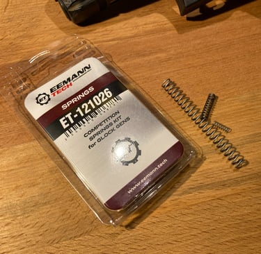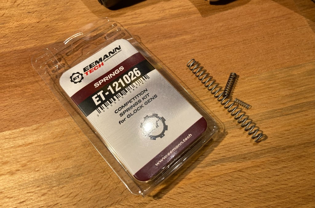 Da die Glock einen teilgespannten Schlagbolzen hat, der bei Betätigung des Abzugs vollgespannt wird und dann bricht, lässt sich der Abzugswiderstand durch das Gewicht der Schlagbolzenfeder einstellen. Um noch ein wenig mehr in die sportlichere Richtung zu gehen, habe ich das Competition Spring Kit von Eemann Tech eingebaut. Hier werden die Schlagbolzenfeder und die Federn der Schlagbolzensicherung, sowie der Abzugsmechanik gegen leichtere getauscht. Der Unterschied ist kaum spürbar. Der Abzugswiderstand ist ein wenig geringer, aber ein Druckpunkt lässt sich kaum spüren. Es ist eher ein rollender Widerstand, der den Schuss irgendwann auslöst. Für IPSC kein Problem, da man den Abzug sowieso einfach durchzieht. Die Glock ist so aber noch weniger eine Präzissionswaffe, wie sie es vorher war. Eine noch leichtere Schlagbolzenfeder möchte ich nicht verbauen, da mir das Risiko für Light Strikes zu groß wird.