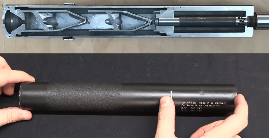 Abbildung 4: Standbild aus dem Video zur MP5SD vom YouTube Kanal "Forgotten Weapons". Oben ist ein Schnittmodell des Schalldämpfers der MP5SD gezeigtl, mit eingeschraubtem Lauf. Schön zu sehen sind die Entlastungsbohrungen direkt am Anfang des Laufs. Unten ist der Schalldämpfer von Außen gezeigt. Quelle: Forgotten Weapons, 2020, https://www.youtube.com/watch?v=snDWL4PvEp8&t=269s