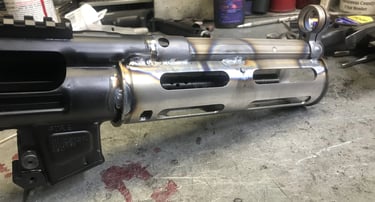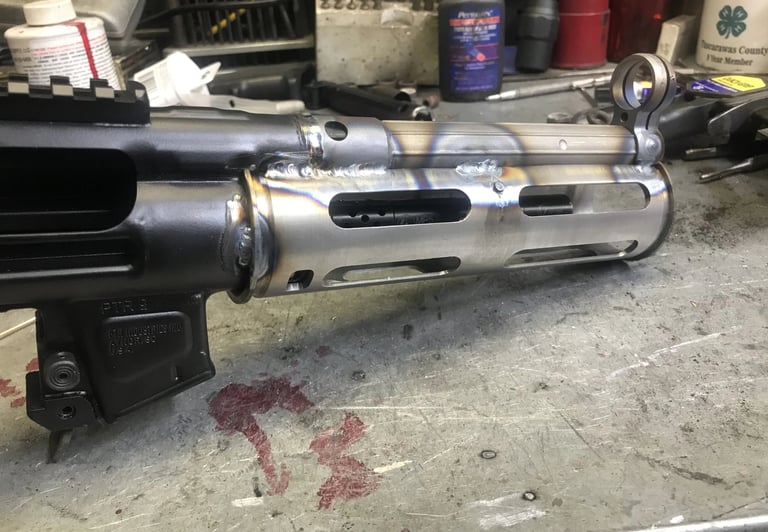 Abbildung 6: Zwischenstand eines Nachbaus einer MP5SD. Gut zu erkennen sind die Schweißpunkte, um den Bausatz zusammen- und in den Standardreceiver einzuschweißen. Quelle: Grease Gunner, Forum HK-Pro, 2020, https://www.hkpro.com/threads/ptr-608-clone-to-mp5sd-clone-conversion.559935/