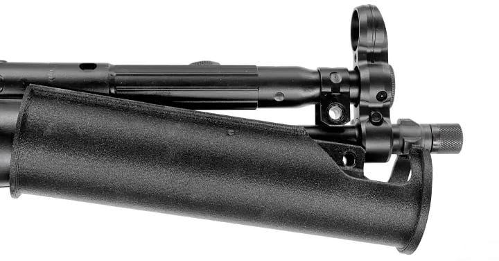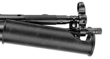 Abbildung 1: Gezeigt ist eine Heckler und Koch MP5SD mit Schubschaft. Charakteristisch sind der Runde Gummihandschutz mit Rillen und der Schalldämpfer, welcher in den Handschutz hineinragt. Quelle: HK-USA.com, 2025, https://hk-usa.com/product/mp5sd/