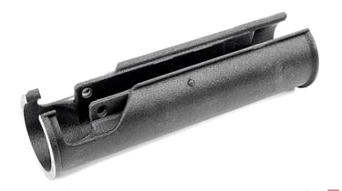 Markant sind die Aussparungen des Adapters im vorderen Bereich. Diese dienen einerseits zur Montage, andererseits um Platz für die Riemenöse zu schaffen, die bei der standard MP5 unterhalb des Durchladerohrs sitzt. Wir erinnern uns: bei der SD Variante wurde diese extra nach oben versetzt um eine Verwendung weiter zu ermöglichen. In dieser Version mit Adapter wird die Öse durch den darüber liegenden Handschutz verdeckt.