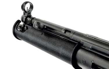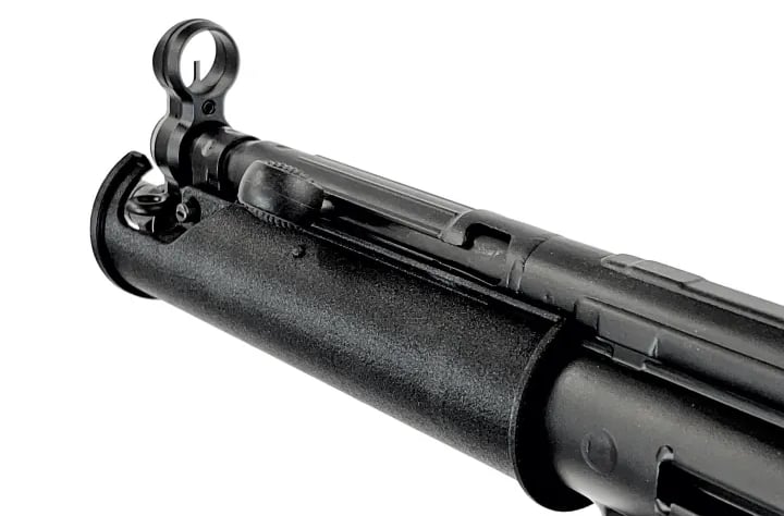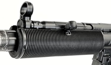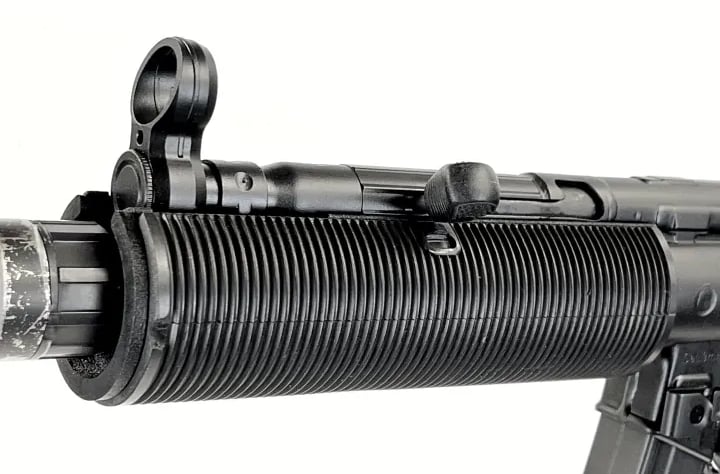 Der runde, legendäre Handschutz sitzt nämlich auf einer eigenen Blechbasis, die mit dem Durchladerohr und dem Reciever verschweißt ist und der Lauf schwingt frei. Hier unterscheidet sich die SD von der standard MP5, bei der das Durchladerohr durch eine Klemme mit dem Lauf stabilisiert wird. Auch wird das Korn mit dem Durchladerohr verschweißt und die Riemenöse nach Oben, neben das Korn gesetzt. Nur so ist dafür Platz ohne mit dem Handschutz zu kollidieren.