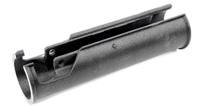 Weiter unten sind Bilder des angesprochenen Bootleg SD Handguard V2 Adapters von der Website hkbryce.com gezeigt. Der Adapter ist 3D-gedruckt mit einem kohlefaserverstärkten Nylon-Filament und soll auch hohe Schussfolgen temperaturtechnisch abkönnen. Gut zu erkennen ist auch die geklemmte Verbindung des Laufes mit dem Durchladerohr. Der Adapter wird mit der Schraube der Klemme befestigt und ragt über die Kornmontage hinaus, sodass die Warzen des Three-Lug-Mündungsfeuerdämpfers bedeckt sind. So kann ein Schalldämpfer oder Blast Deflector montiert werden, sodass dieser scheinbar in den Handschutz hineinragt.