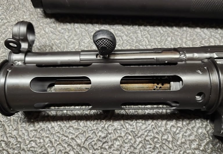 Abbildung 5: Bild eines Nachbaus einer MP5SD mit demontiertem Schalldämpfer und abgenommenem Handschutz. Zu sehen ist der kurze Lauf der Waffe, verglichen mit der Standard MP5 und den Entlastungsbohrungen direkt hinter dem Gewinde für den Schalldämpfer. Quelle: kbinmt, Forum HK-Pro, 2023, https://www.hkpro.com/threads/ap5-for-mp5sd-conversion.549955/.