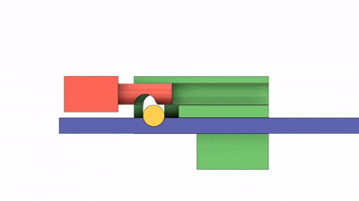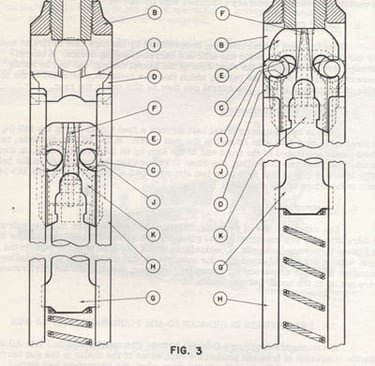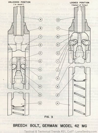 Abbildung 4: Skizzierter Mechanismus des Systems des MG42. Der Verschluss wird durch die Verschlussfeder in die vordere Stellung gedrückt. Das Steuerstück im Verschluss drückt durch die Federkraft die Rollen nach außen. Lässt die Steuerkurve im vorderen Bereich des Gehäuses das Ausrücken der Rollen zu, verriegeln diese mit dem Lauf. Bei Schussabgabe werden durch den Rückstoß Lauf und Verschluss zusammen nach hinten geschoben. Die Steuerkurve des Gehäuses drückt die Rollen in den Verschluss, diese trennen so den Verschluss vom Lauf. Quelle: Tactical and Technical Trends, No. 31, August 12, 1943.