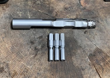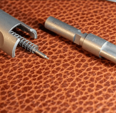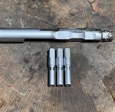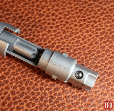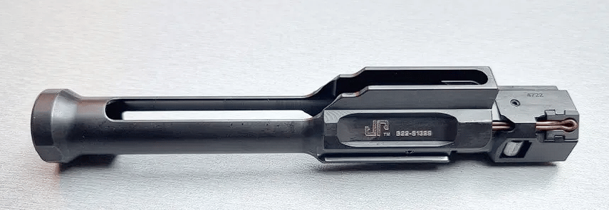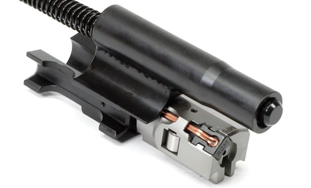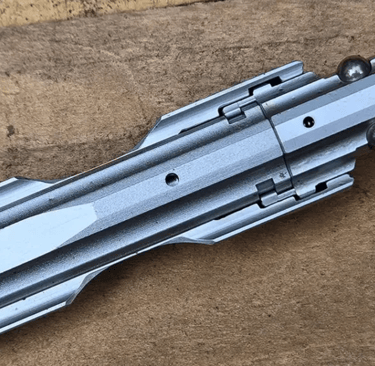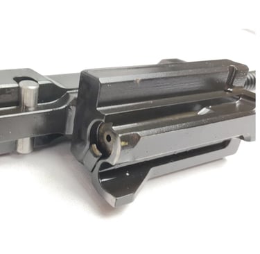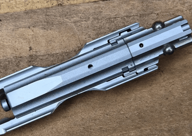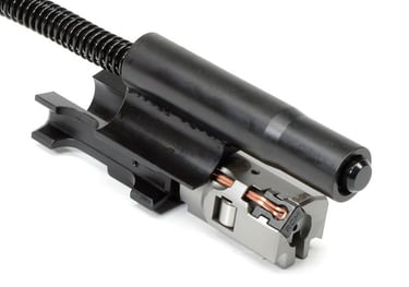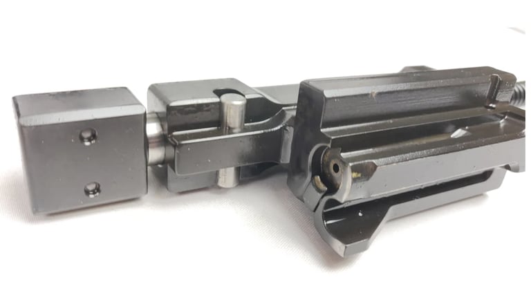 Abbildung 10: Nachbau Ersatzverschluss für die HK MP5 von RCM. In Schwarz gehalten ist der Verschlussträger mit der Verschlussfeder, welche den Verschluss in die Vordere Position drückt. In blankem Stahl ist der Verschlusskopf zu sehenm, mit den Verschlussrollen in eingefahrenem Zustand. Quelle: RTG Parts, https://www.robertrtg.com/rcm-mp5-9mm-bolt-group-complete-new, 2025