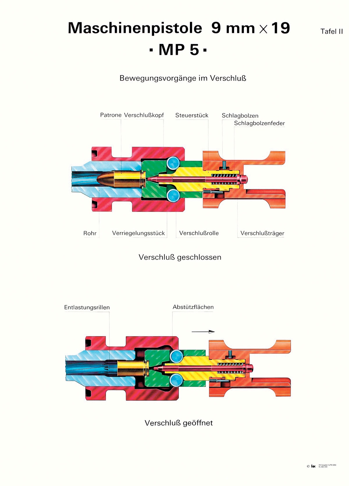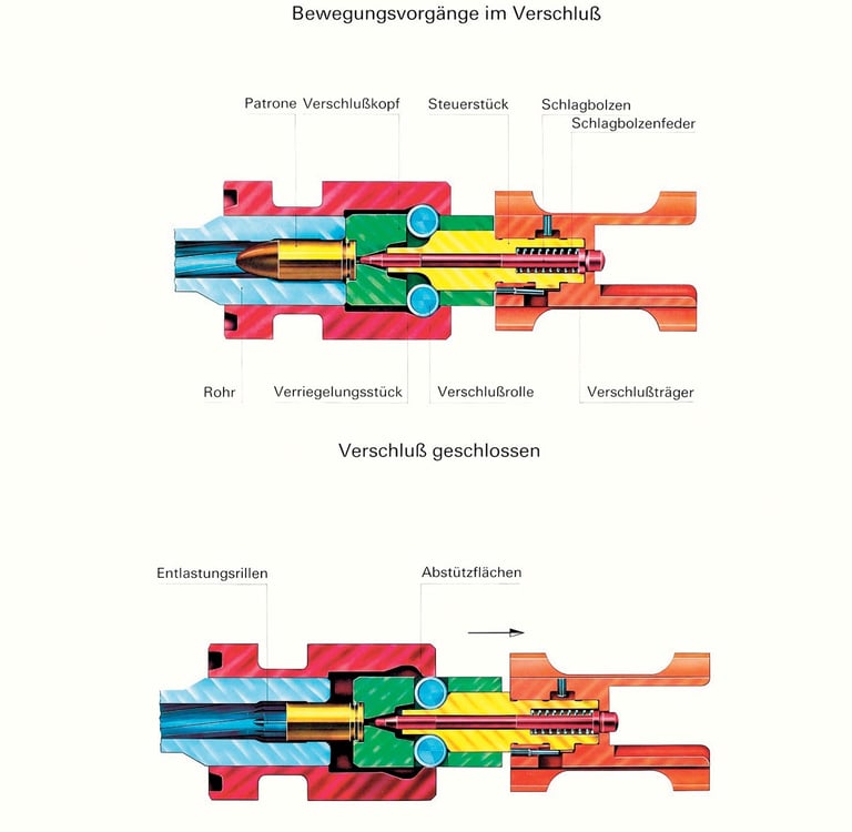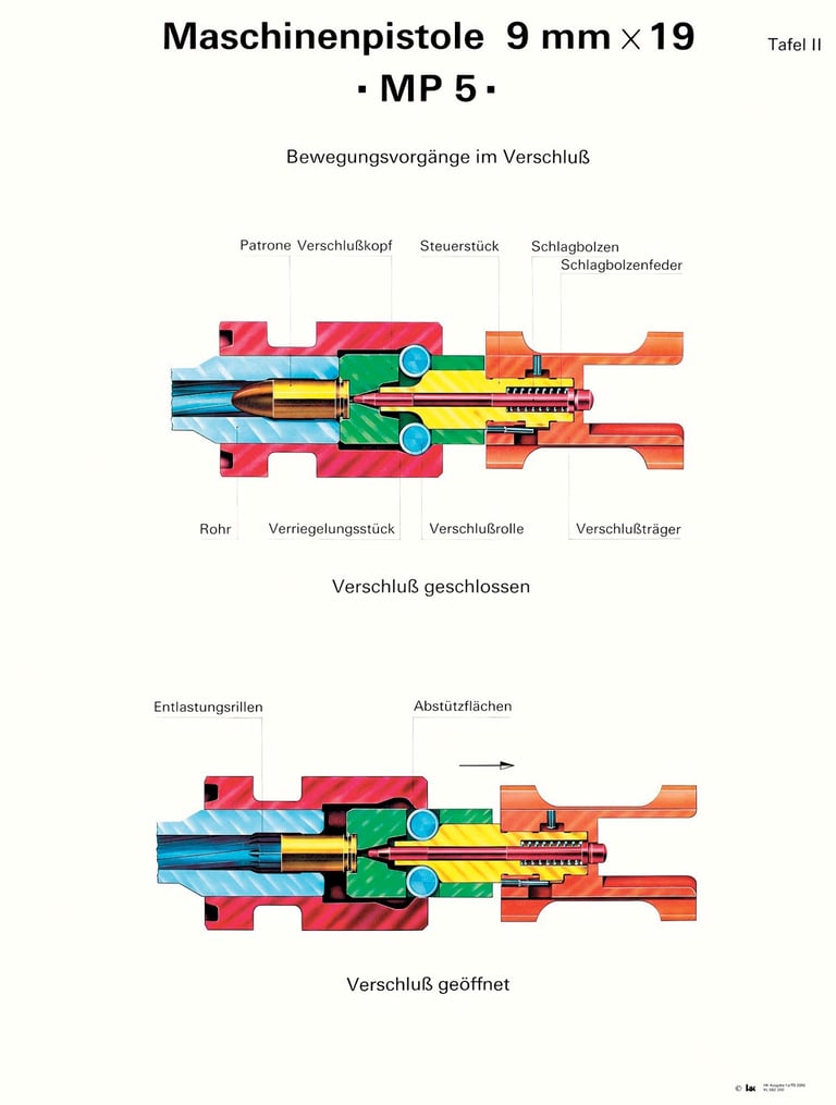 Abbildung 9: Schulungstafel zum Verschlusssystem der HK MP5. Der Mechanismus ist analog zum Verschluss des HK G3 und wurde angepasst auf die 9 mm Luger Patrone. Beim Schuss wirkt der Gasdruck auf den Verschlusskopf, dessen Bewegung durch die Rollen verzögert wird. Durch die Kraft auf die Rollen werden diese nach innen gedrückt. Die Rollen beschleunigen dabei über die schrägen Flächen das Steuerstück. Quelle: Heckler und Koch, 2010