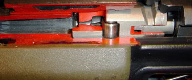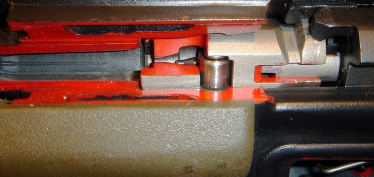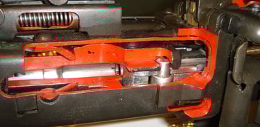 Abbildung 2: Schnittmodell des MG42 Verschlusses. Zu erkennen sind die Verriegelung von Lauf und Verschlusskopf durch die Rolle und die Steuerkurve, die für das Einrücken der Rolle verantwortlich ist. Quelle: Edmond HUET, DCB Shooting, Quickload, 2025