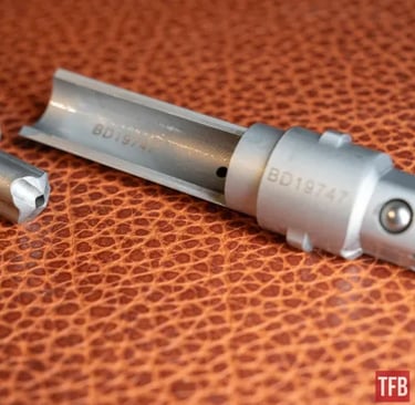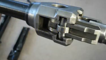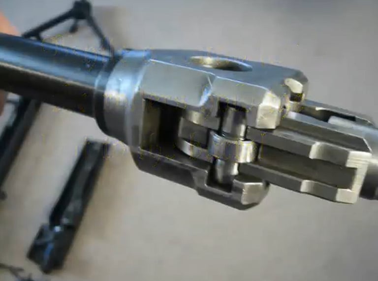 Abbildung 3: Detailaufnahme des Rollenverschlusses zwischen Verschlusskopf und Lauf des MG42 in ausgebautem Zustand. Quelle: Darivs Architectvs - YouTube, https://www.youtube.com/watch?v=BERGobm537A&t=2s, 2025